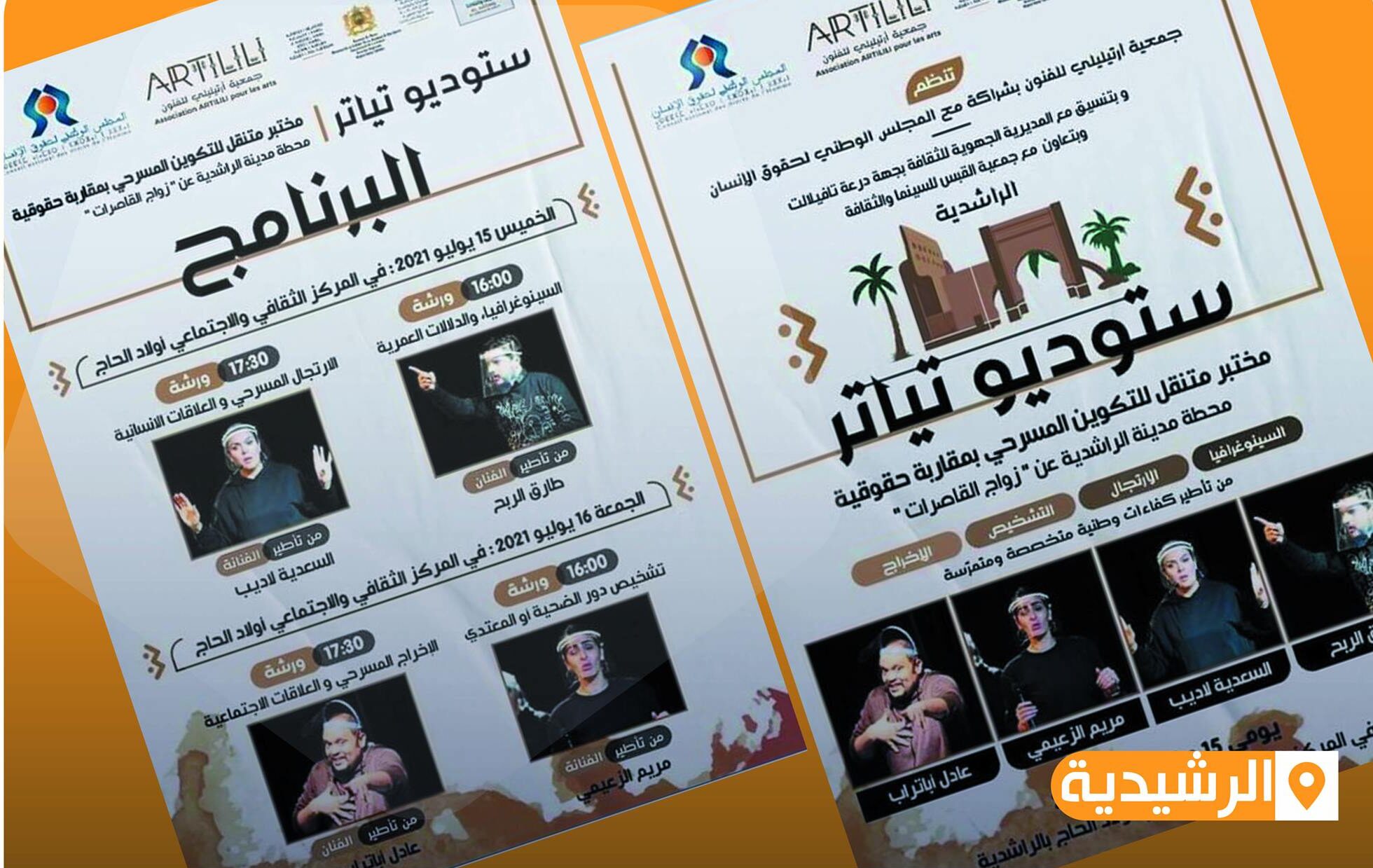 تنظم جمعية ارتيليلي للفنون بشراكة مع المجلس الوطني لحقوق الانسان وبتنسيق مع المديرية الجهوية للثقافة بجهة درعة تافيلالت، وبتعاون مع جمعية القبس للسينما والثقافة بالرشيدية، مختبر متنقل للتكوين المسرحي بمقاربة حقوقية، يومي 15 و 16 يوليوز 2021 بالمركز الثقافي والإجتماعي أولادالحاج بالرشيدية.