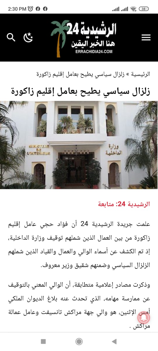 تداول منبر محلي بجهة درعة تافيلالت، خبر توقيف عامل إقليم زاكورة، السيد فؤاد حجي، مدعيا انه من ضمن مجموعة من العمال و القياد الذين شملهم الزلزال السياسي و والي جهة.
