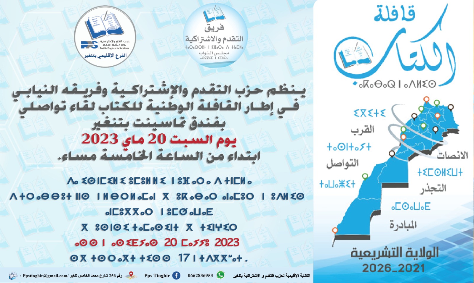 يرتقب أن ينظم حزب التقدم والاشتراكية وفريقه النيابي في إطار القافلة الوطنية للكتاب، لقاء تواصليا وزيارة لعدة جماعات محلية يوم السبت 20 ماي 2023، من بينها جماعة أيت سدرات الجبل السفلى إقليم تنغير التي يسيرها نفس الحزب بأغلبية بدأ الرئيس بفقدانها خلال الدورات الماضية.