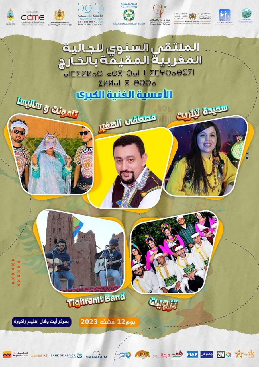تنظم جمعية زاكورة للمهاجر الدورة الثانية الملتقى السنوي للجالية المغربية المقيمة بالخارج، تحت شعار ” مغاربة العالم بين سؤال الهوية و تحديات الاندماج”، خلال الفترة الممتدة من 10 إلى 13 غشت 2023 بمركز جماعة ايت ولال اقليم زاكورة.
