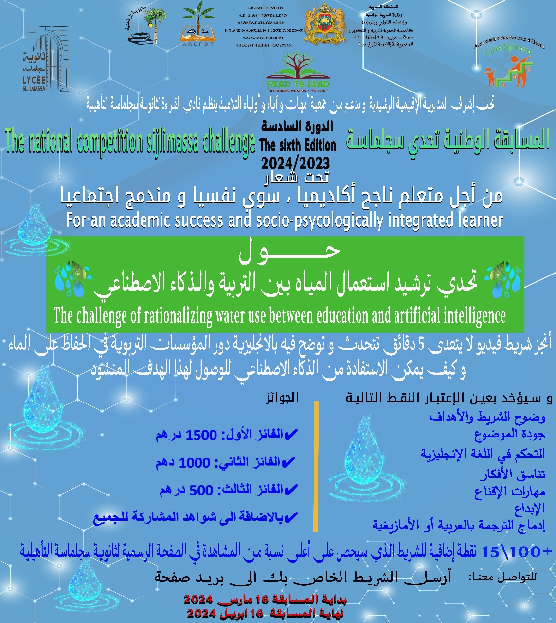 وتتناول الدورة السادسة للمسابقة المذكورة موضوع “تحدي ترشيد استعمال المياه بين التربية والذكاء الاصطناعي”، من خلال إنجاز فيديو لايتعدى 5 دقائق وإرساله لبريد الصفحة الرسمية لثانوية سجلماسة التأهيلية بالرشيدية، يتحدث ويوضح فيه باللغة الإنجليزية دور المؤسسات التربوية والتعليمية في الحفاظ على الماء وكيف يمكن الاستفادة من الذكاء الاصطناعي لبلوغ هذا الهدف.
