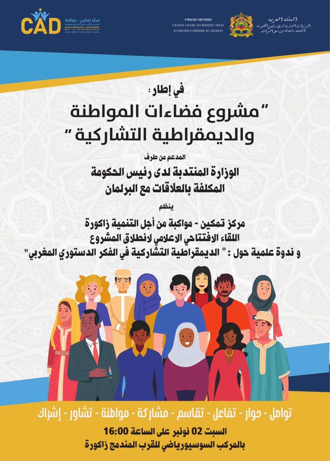 وينظم هذه اللقاء في سياق مشروع “فضاءات المواطنة والديمقراطية التشاركية”الذي سينفذه المركز بدعم من الوزارة المنتدبة لدى رئيس الحكومة المكلفة بالعلاقات مع البرلمان؛ خلال موسم 2024/2025، بهدف التواصل على نطاق واسع مع المواطنين والمواطنات ومختلف فعاليات المجتمع المدني بإقليم زاكورة، حول الديمقراطية التشاركية لتعزيز المشاركة المواطنة، وتمكين المشاركين من آليات الديمقراطية التشاركية، إضافة إلى تعبئة الديناميات الشبابية والفاعلين الترابيين والمجتمع المدني على المستوى المحلي من أجل  الإسهام في تفعيل ورش الديمقراطية التشاركية والمشاركة المواطنة، مما  سيدعم المشاركة الواسعة في النقاش العمومي والمشاركة في اتخاذ القرار السياسي.