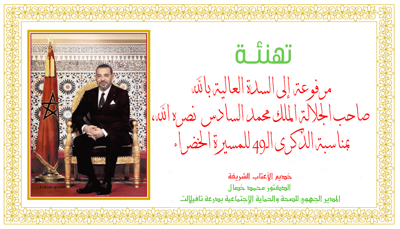 بمناسبة تخليد الذكرى التاسعة والأربعين المسيرة الخضراء المظفرة، يتشرف الدكتور محمد خصال، المدير الجهوي للصحة والحماية الإجتماعية لدرعة تافيلالت، أصالة عن نفسه ونيابة عن كافة الأطر الطبية والصحية و مستخدمي المديرية، بتقديم أصدق عبارات التهاني إلى السدة العالية بالله صاحب الجلالة الملك محمد السادس نصره الله وأيده وإلى الأسرة الملكية الشريفة وإلى جميع المغاربة داخل الوطن وخارجه، راجيا من العلي القدير أن ينعم على بلدنا بمزيد من التقدم والطمأنينة والاستقرار.