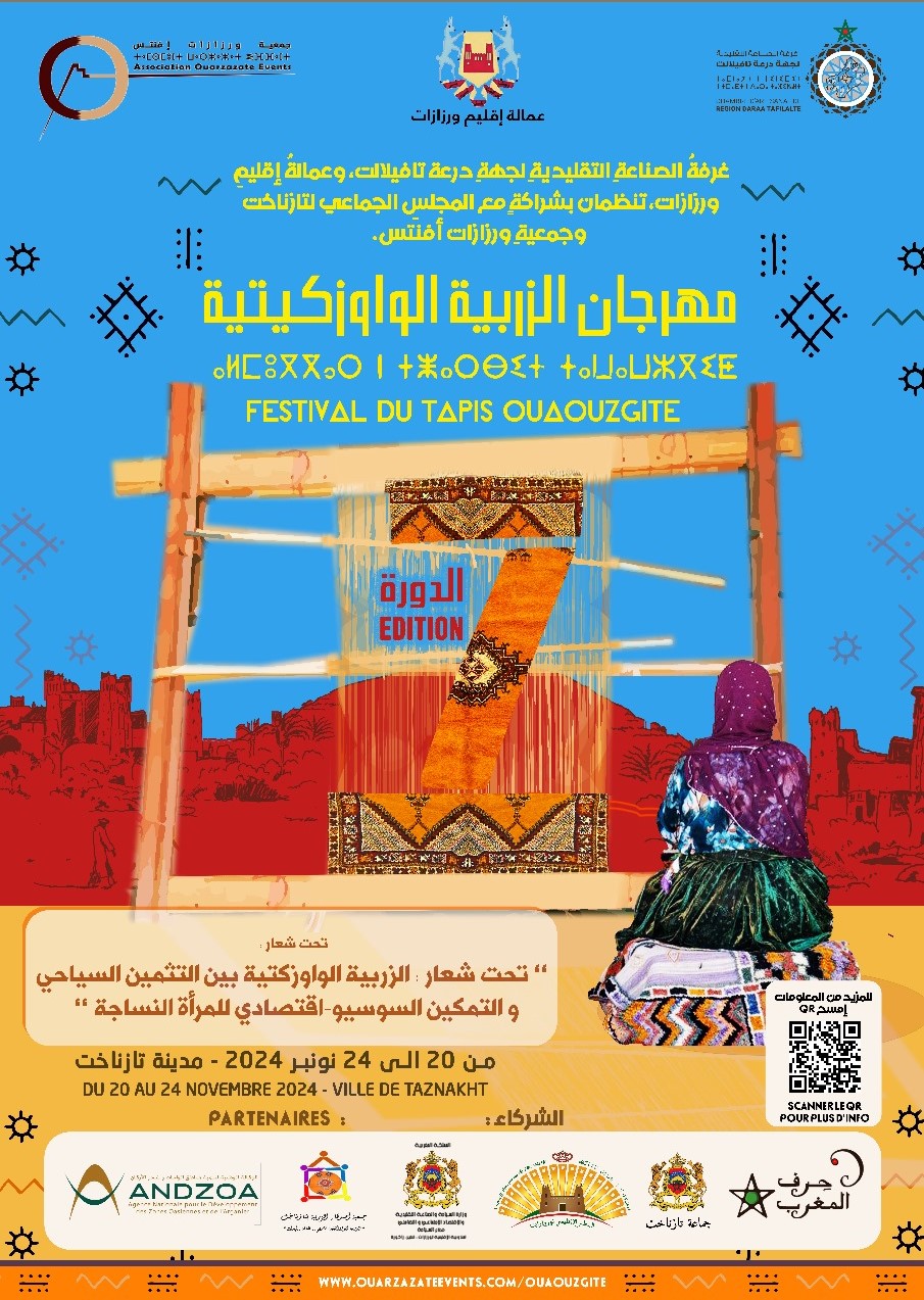 تحتضن مدينة تازناخت التابعة ترابيا لإقليم ورزازات، فعاليات النسخة السابعة لمهرجان الزربية الواوزكيتية من 20 إلى 24 نونبر 2024، وذلك تحت شعار “الزربية الواوزكيتية بين التثمين السياحي والتمكين السوسيو-اقتصادي للمرأة النساجة” .