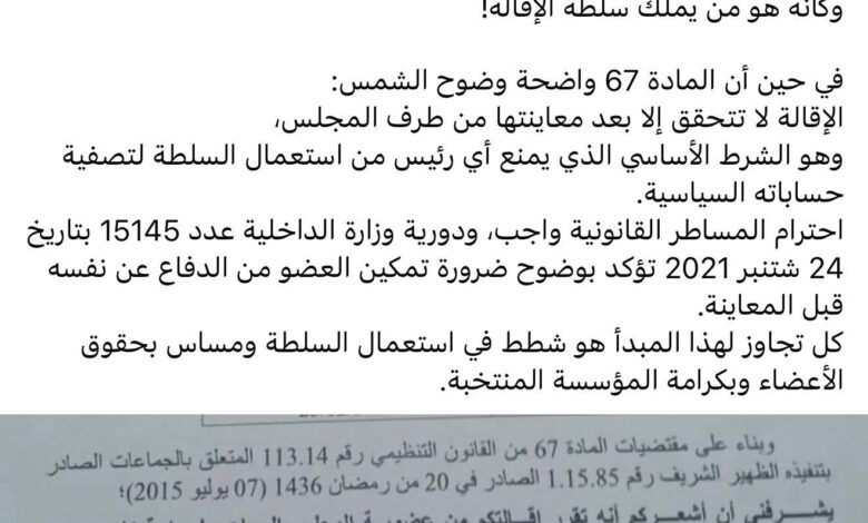 من جهتها، تعتبر المعارضة، أن الرئيس تجاوز صلاحياته عندما أنهى مراسلته بعبارة تفيد “استيفاء جميع الإجراءات والمساطر القانونية”، مشيرة إلى أن المادة 67 من القانون المذكور تنص على أن الإقالة لا تعتبر قائمة إلا بعد معاينتها من طرف المجلس الجماعي، وبعد تمكين العضو المعني من حق الدفاع عن نفسه. واعتبرت المعارضة أن تجاوز هذه الخطوة يشكل “شططا في استعمال السلطة ومساسا بحقوق المنتخبين”.