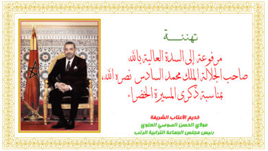 بمناسبة احتفال الشعب المغربي قاطبةً بالذكرى الخالدة للمسيرة الخضراء المظفرة، رمز الإرادة الوطنية ومسيرة البناء والوحدة، أتشرف، أصالة عن نفسي ونيابة عن أعضاء مجلس جماعة أرفود وساكنتها، أن أرفع إلى المقام السامي صاحب الجلالة الملك محمد السادس نصره الله وأيده، أسمى آيات التقدير والإخلاص، مقرونة بأصدق التهاني وأطيب المتمنيات.
