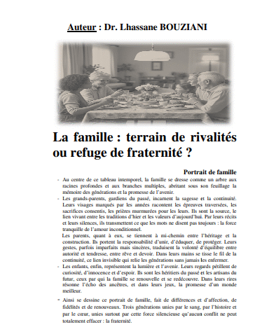 صدر مؤخرًا للدكتور الحسن بوزياني كتاب جديد باللغة الفرنسية بعنوان : La famille : terrain de rivalités ou refuge de fraternité  في مقدمة كتابه وضع الدكتور بوزياني  صورة عائلية لما تتميز به هده الاخيرة من ملاذ للأخوة، عبارة عن لوحة : في قلب هذه اللوحة الخالدة، تقف العائلة كشجرةٍ ذات جذورٍ عميقةٍ وفروعٍ متعددة، تظلّل بأوراقها ذاكرة الأجيال ووعد المستقبل.