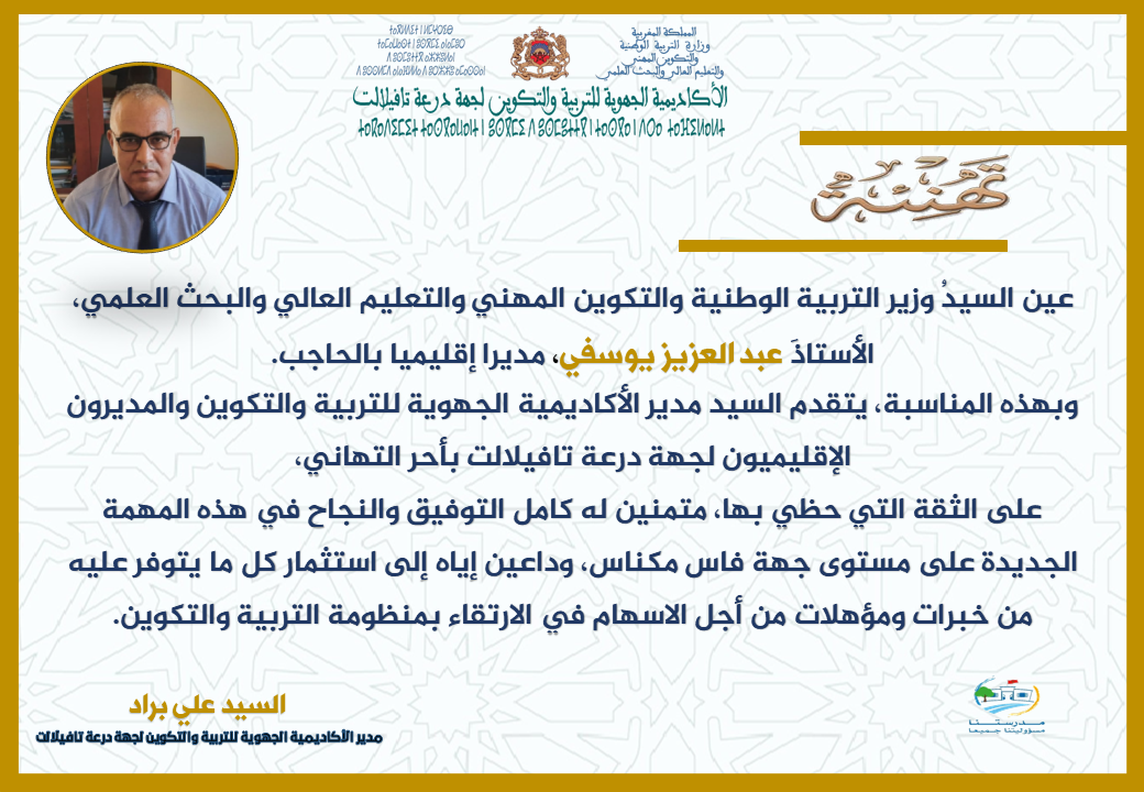 و تقدم السيد مدير الأكاديمية الجهوية للتربية والتكوين بجهة درعة تافيلالت، والمديرون الإقليميون لجهة درعة تافيلالت، بتهنئة المدير الإقليمي الجديد للحاجب، متمنين له التوفيق والنجاح في مهمته الجديدة على مستوى جهة فاس مكناس، وداعين إياه إلى استثمار كل ما يتوفر عليه من خبرات ومؤهلات من أجل الاسهام في الارتقاء بمنظومة التربية والتكوين.
