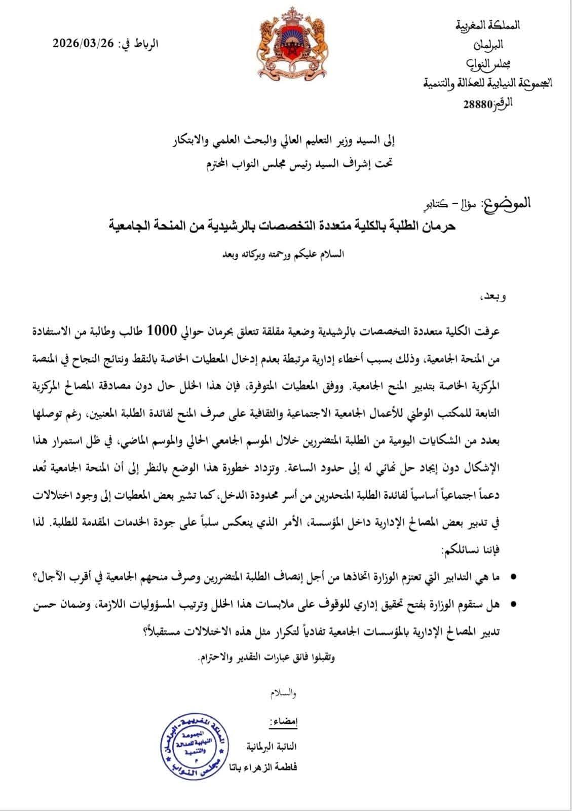 في هذا السياق، تقدمت النائبة البرلمانية فاطمة الزهراء باتا بسؤال كتابي إلى الوزير الوصي، تساءلت فيه عن الإجراءات المستعجلة التي تعتزم الوزارة اتخاذها لإنصاف الطلبة المتضررين وصرف منحهم في أقرب الآجال، إلى جانب إمكانية فتح تحقيق إداري لتحديد المسؤوليات المرتبطة بهذا الخلل، وضمان عدم تكرار مثل هذه الاختلالات داخل المؤسسات الجامعية.