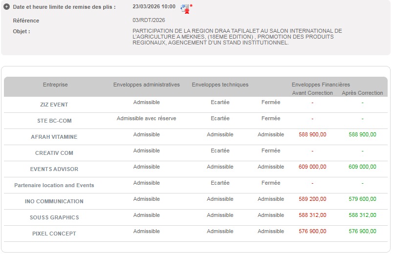 وعاينت الجريدة، حاليا، الامتناع الثاني عن نشر محضر فوز الشركة نفسها من طرف ادارة الجهة، على البوابة الوطنية للصفقات العمومية، بصفقة تنظيم معرض مؤسساتي في إطار الدورة الثامنة عشرة للفلاحة بمكناس، بمبلغ يتجاوز ال80 مليون سنتيم، والذي يتبين من خلال المعطيات المالية المنشورة، أن الشركة نفسها فازت بالصفقة مجددا.