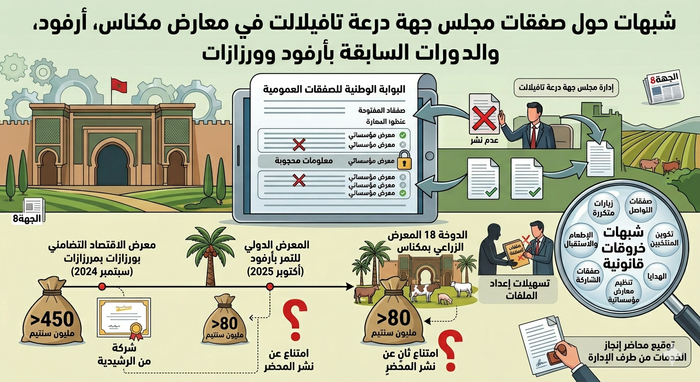 نشرت جريدة الجهة8، قبيل انطلاق فعاليات النسخة الماضية للمعرض الدولي للتمر بأرفود، سلسلة من المقالات حول امتناع إدارة مجلس جهة درعة تافيلالت عن نشر ملخص محضر فتح أظرفة الصفقة المتعلقة بتنظيم معرض مؤسساتي داخل الملتقى الدولي للتمر، الذي نظم يوم 29 أكتوبر 2025.
