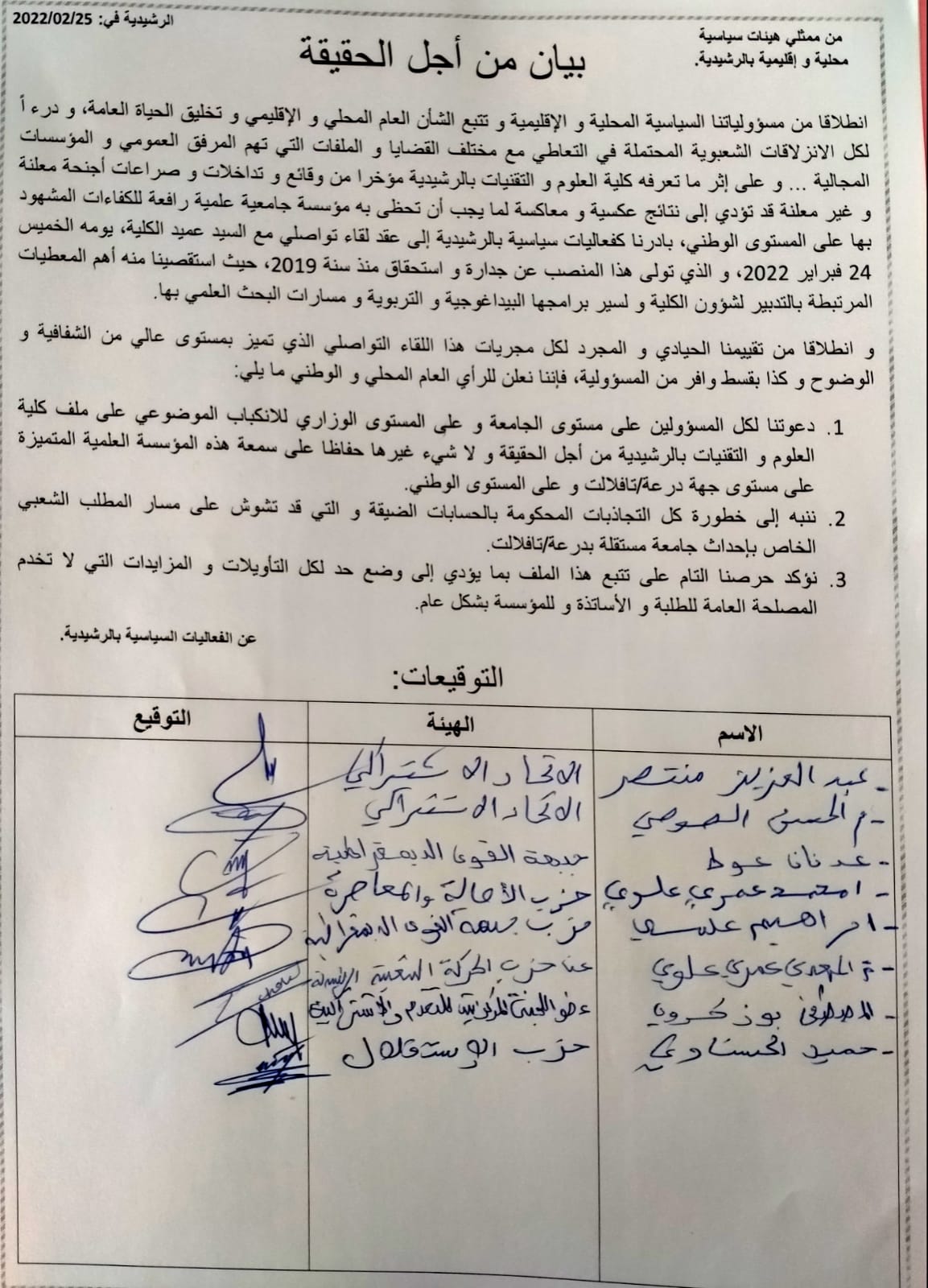 أعلنت مجموعة من الأحزاب الموقعة على بيان “من أجل الحقيقة” ، الذي أصدره أشخاص يزعمون تمثيلهم للهيئات السياسية المحلية والاقليمية بالرشيدية، حول ما تشهده كلية العلوم والتقنيات بالرشيدية من تطورات و وقائع، (أعلنت) تبرؤها من هؤلاء الأشخاص، نافية أن تكون على علم ما جرى.