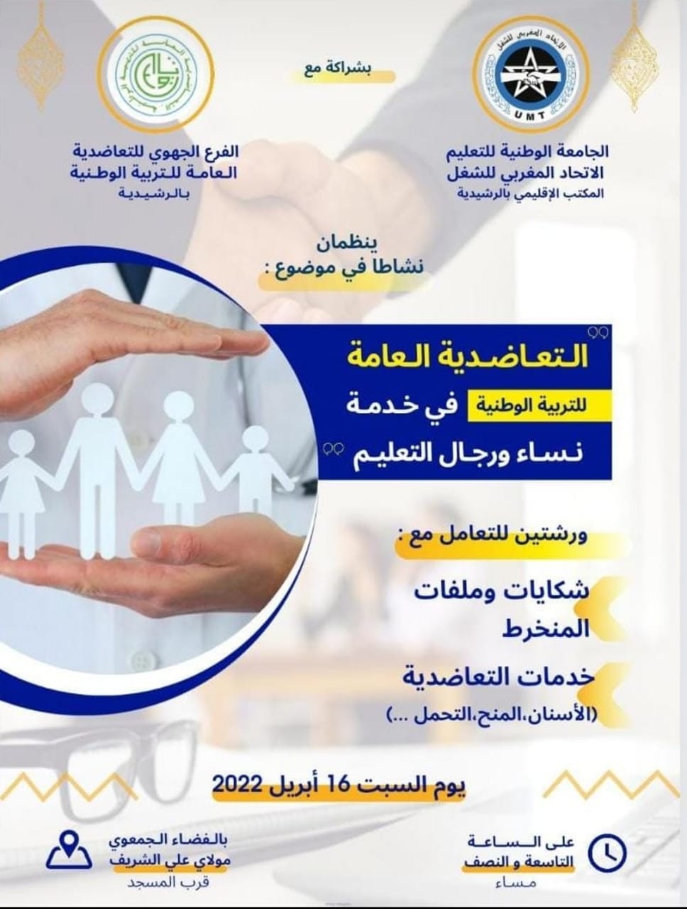 ينظم المكتب الاقليمي للجامعة الوطنية للتعليم المنضوي تحت لواء الاتحاد المغربي للشغل بالرشيدية، نشاطا نضاليا، بشراكة مع الفرع الجهوي للتعاضدية العامة للتربية الوطنية بالرشيدية، وذلك يوم السبت المقبل، إبتداءا من الساعة التاسعة مساءا، بالفضاء الجمعوي مولاي علي الشريف بالرشيدية.