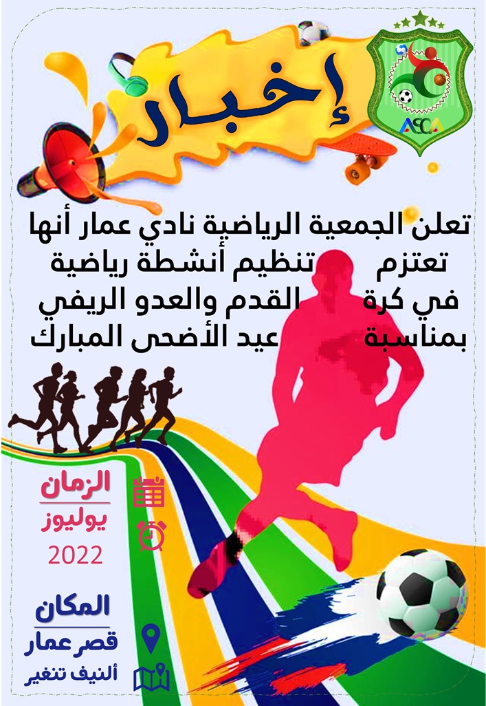 تنظم الجمعية الرياضية نادي عمار، بمناسبة عيد الأضحى المبارك، أنشطة رياضية، في مختلف الرياضات لفائدة جميع الفئات،( دوري في كرة القدم، و العدو الريفي)بقصر عمار، دائرة ألنيف، إقليم تنغير.
